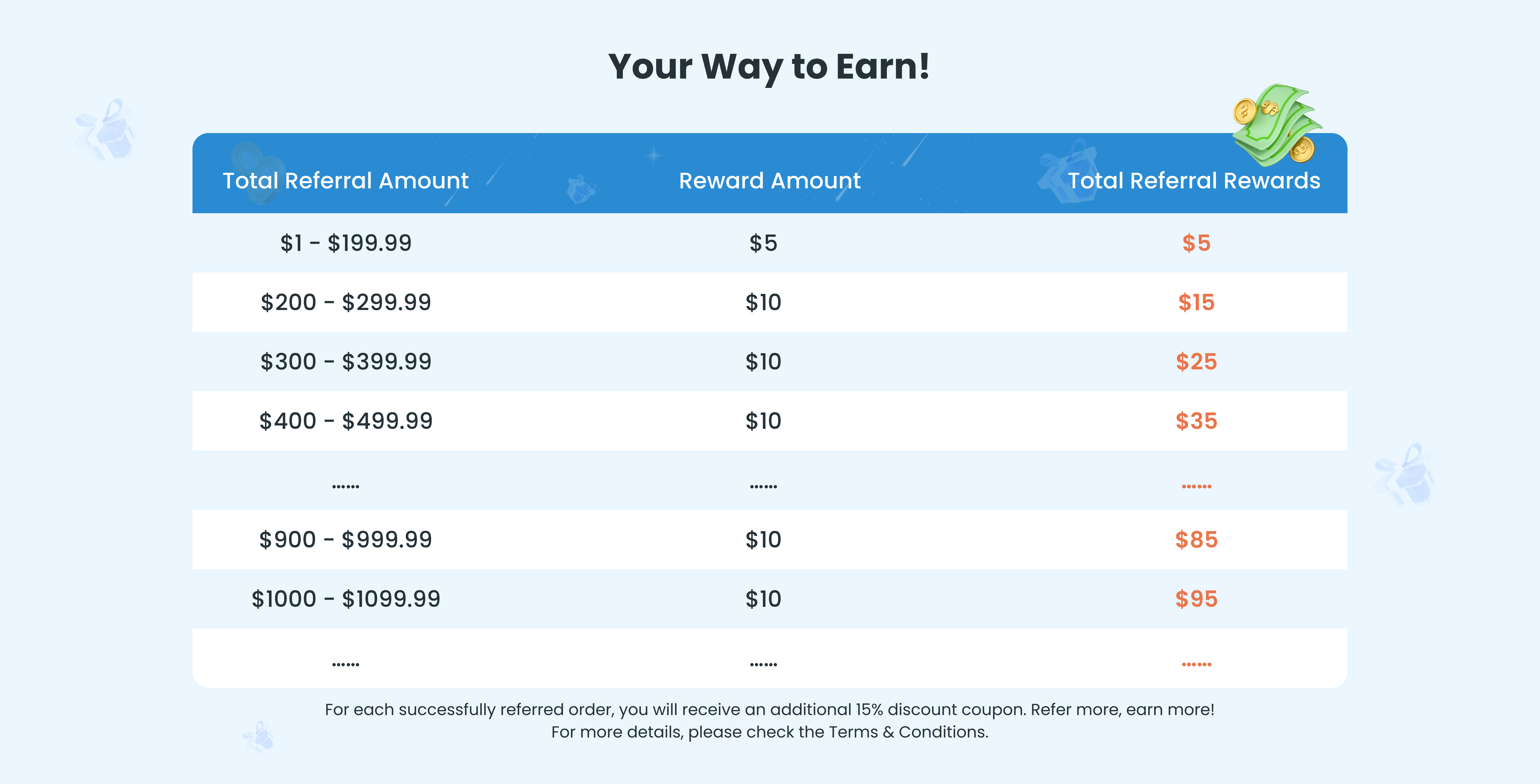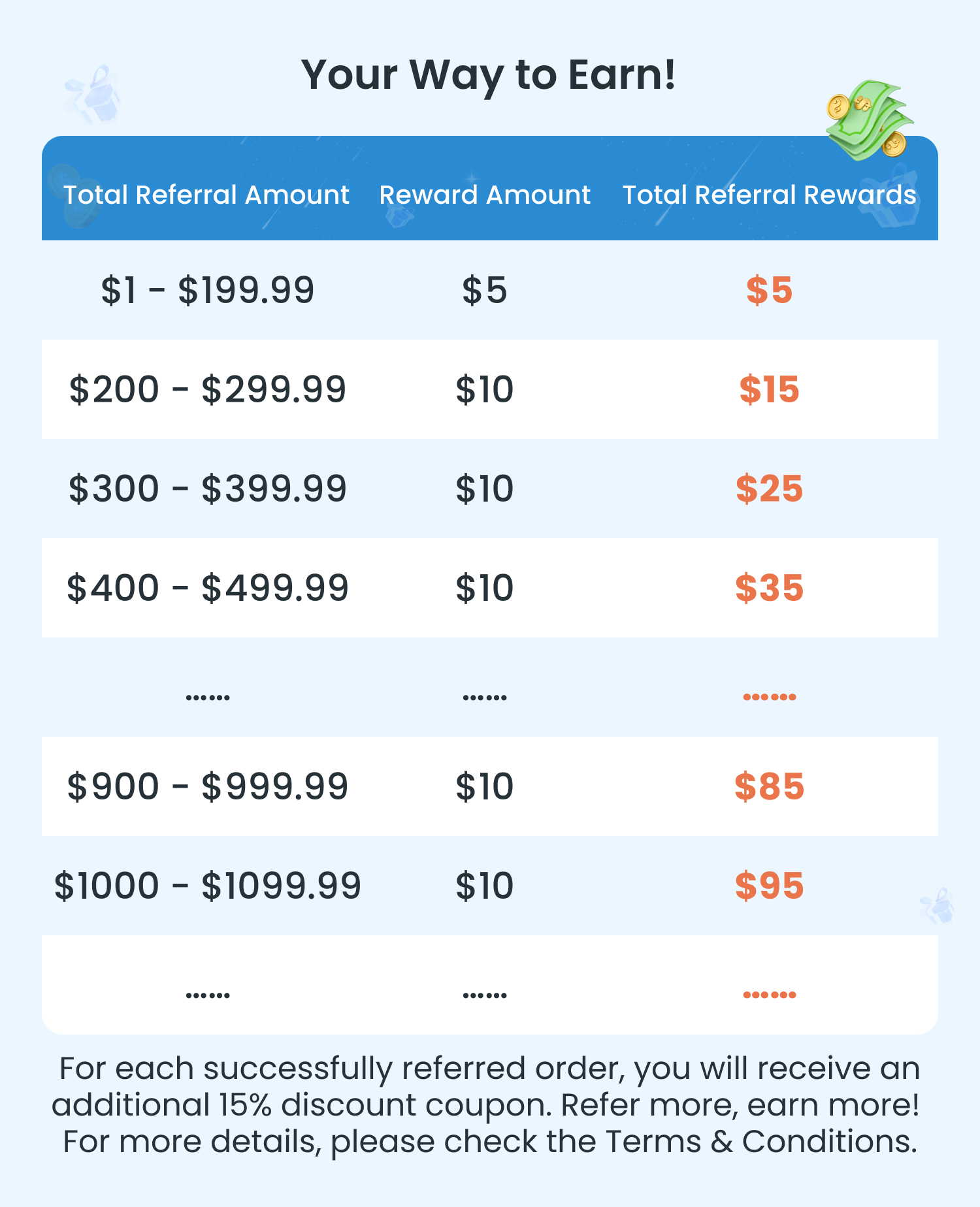 - Cash reward. Based on the total cumulative order amount from referred users' successful orders: when the cumulative order amount is greater than 0 but less than $200, you will receive a $5 cash reward; when the cumulative order amount reaches $200, you will receive an additional $10 cash reward. Starting from $200, for every additional $100 in cumulative order value, you will receive an additional $10 cash reward, with no limit on the rewards.