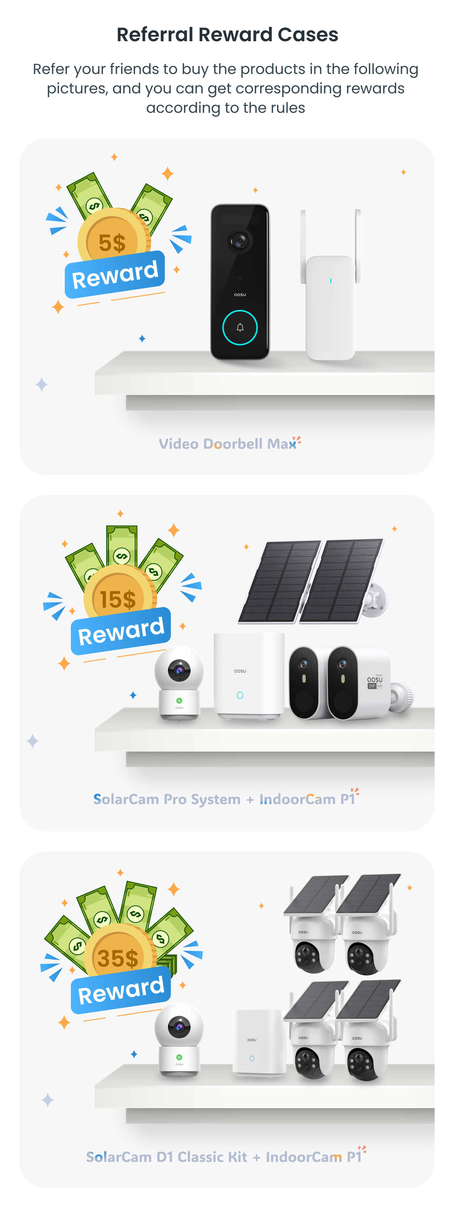 - Cash reward. On the 5th of each month, you will receive an email from community@aosulife.com notification the total cumulative referral order amount from the previous month, along with the settlement of new rewards from the month before last. Rewards can be settled via PayPal or Amazon gift cards.