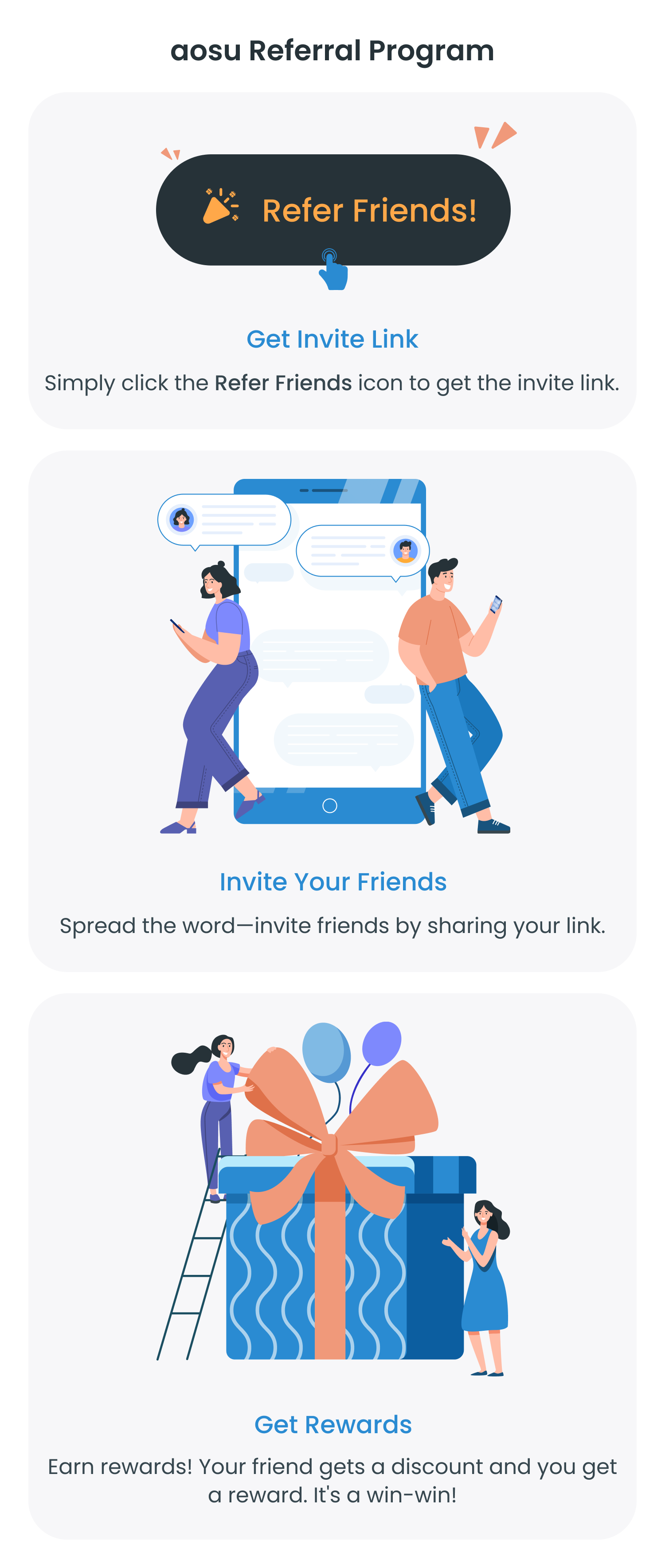 - If you haven’t successfully invited anyone yet, you can still view the specific referral reward information in the Referral page. For any questions, please reach out us by sending email to community@aosulife.com.