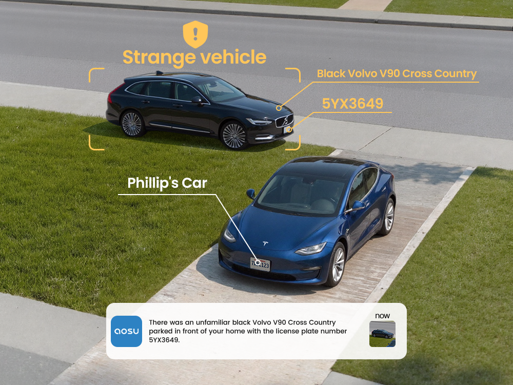 Recognizes family vehicles and detects suspicious vehicle activity using color, model, and plate.