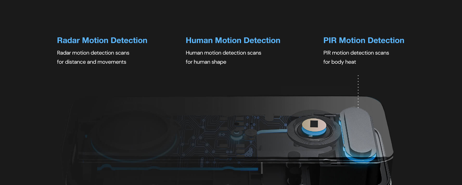 - Triple Motion Detection Technology: Never get a false alert. Our advanced radar and PIR motion sensors and intelligent detection system work together to distinguish and track near and far objects, and determines if they are people, animals, or vehicles.